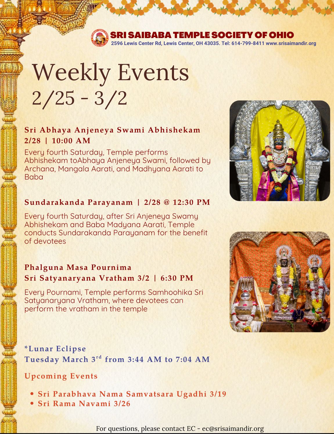 We all Hindus regard “Murthis” or “Vigrahas” as living manifestations of Divinity. In our Saibaba Temple we do have four different “Murthis”, along with our own Shirdi Saibaba in the center of the sanctum hall. After the temple was inaugurated and after “ Vigraha Prana Pratishta”, rituals need to be performed regularly according to Agama sastram. They are called “Utasavas”- and are performed nitya (daily) varotsava (weekly), paksha (fortnight), masotsava (monthly) etc Utsavams. As we may be missing some of these utsavas, our priests and Temple committee came up with these Abhishekams to each deity once a month to replenish the power for the “Murthis/Vigrahas”. Our Saibaba Temple has Sri Satyanarayana swamy Abhishekam on every first Saturday of the month, Sri Saibaba Abhishekam on every second Saturday of the month, Sri Rajarajeshwari Abhishekam on every third Saturday of the month, and Sri Hanuman Abhishekam on every fourth Saturday of the month. Typically “Panchamruthalu (five nectars)” – five different items are used for Abhishekam. They are Milk (Water), Yogurt (Earth), Ghee (Fire), Honey (Ether), Sugar (Air). Each of them is linked to one of the five elements of Nature. When we devotees do these panchamrutha abhishekam, we are essentially requesting the God to purify and balance the external physical world and our own subjective perception of it. Abhishekam, is performed pouring each one of the panchamrutha’s on to the Murthi with chanting of vedic mantras creating a vibrational effect which transforms the surrounding environment as well as the devotees who are witnessing and performing it. The positivity and spiritual energy created effortlessly uplifts everyone who attends the abhishekam. Abhishekams performed at home also gives similar effect or benefit, but witnessing or performing at temple when priests are performing to the Pranaprathista Murthies or Vigrahas, the effect is multiplied and enormous. So all devotees are requested to come and participate in Abhishekam every Saturday.