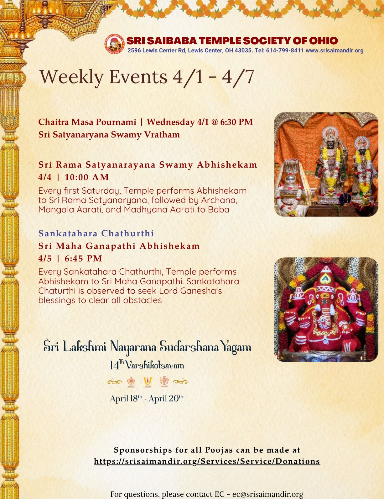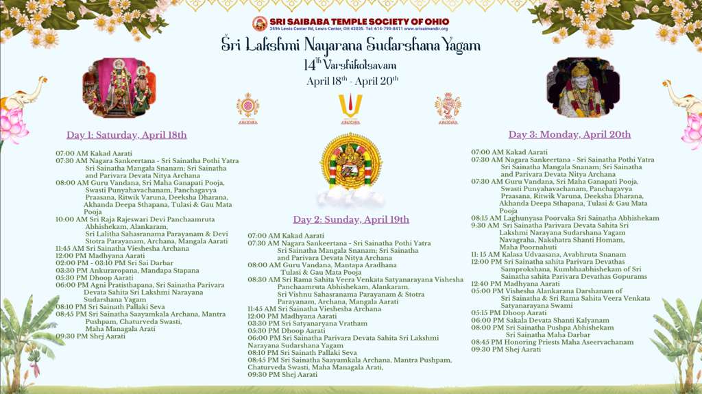 Sri Hari Hara Hiranyagarbhathmaka Ramasahitha Veera Venkata Satyanarayana Swamy. In 2006, the Society purchased 7.73 acres of land on Lewis center Road in Lewis Center, Ohio. Sankhusthapana (Groundbreaking) for the
