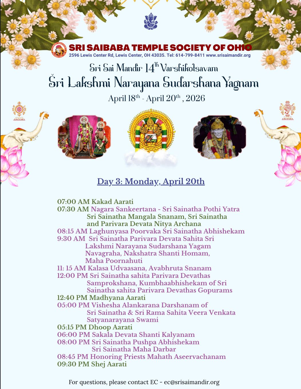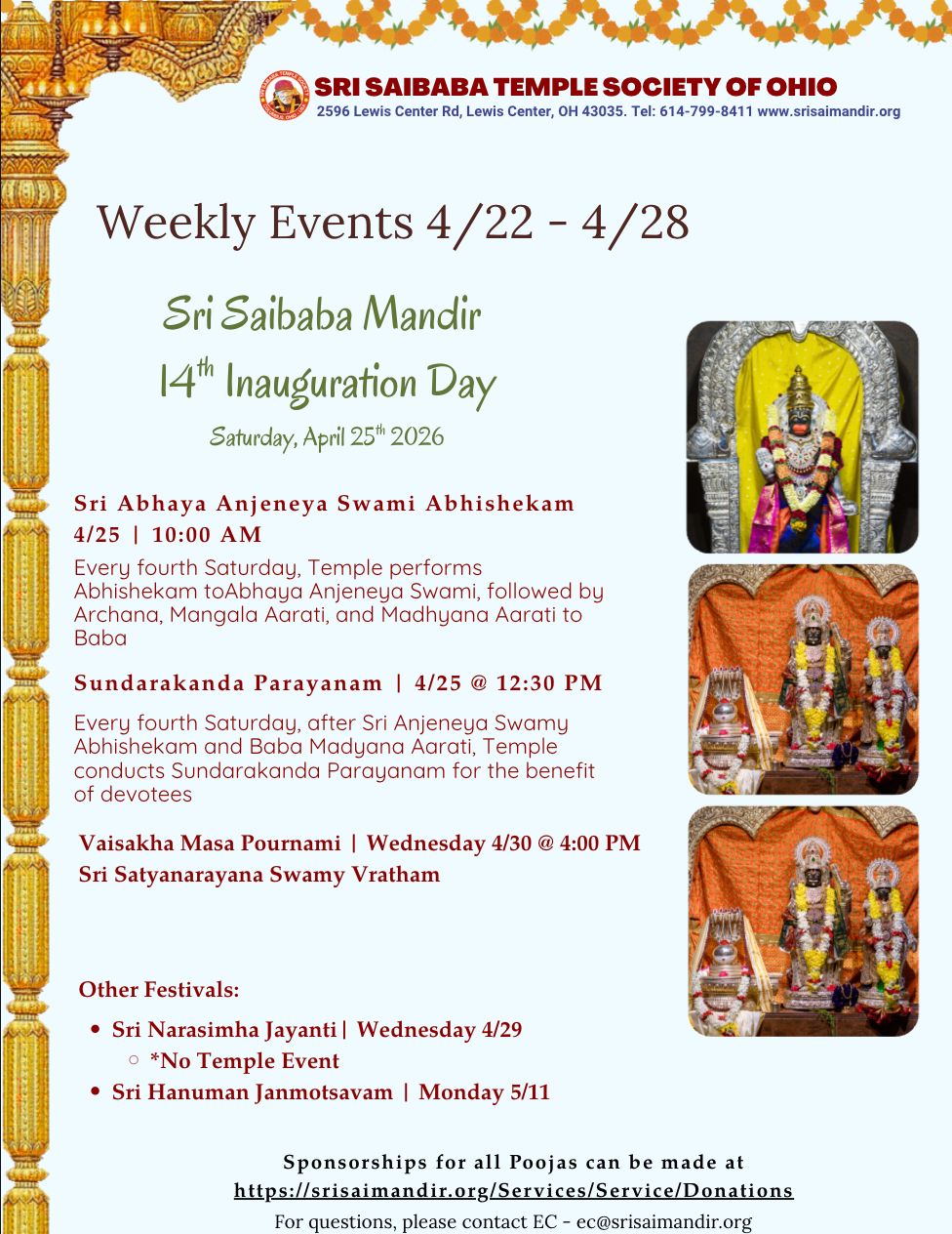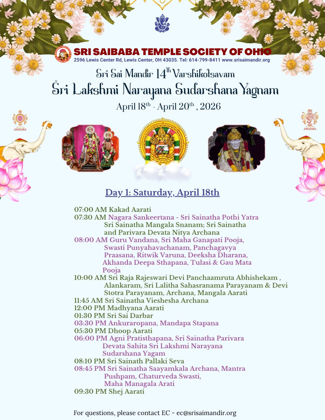 Devotees number grew over a period of time to hundreds, space was leased at New Market Mall, Columbus to provide a central place of worship for all Saibaba devotees. By the will and grace of Sri Saibaba, Sri SaiBaba Temple