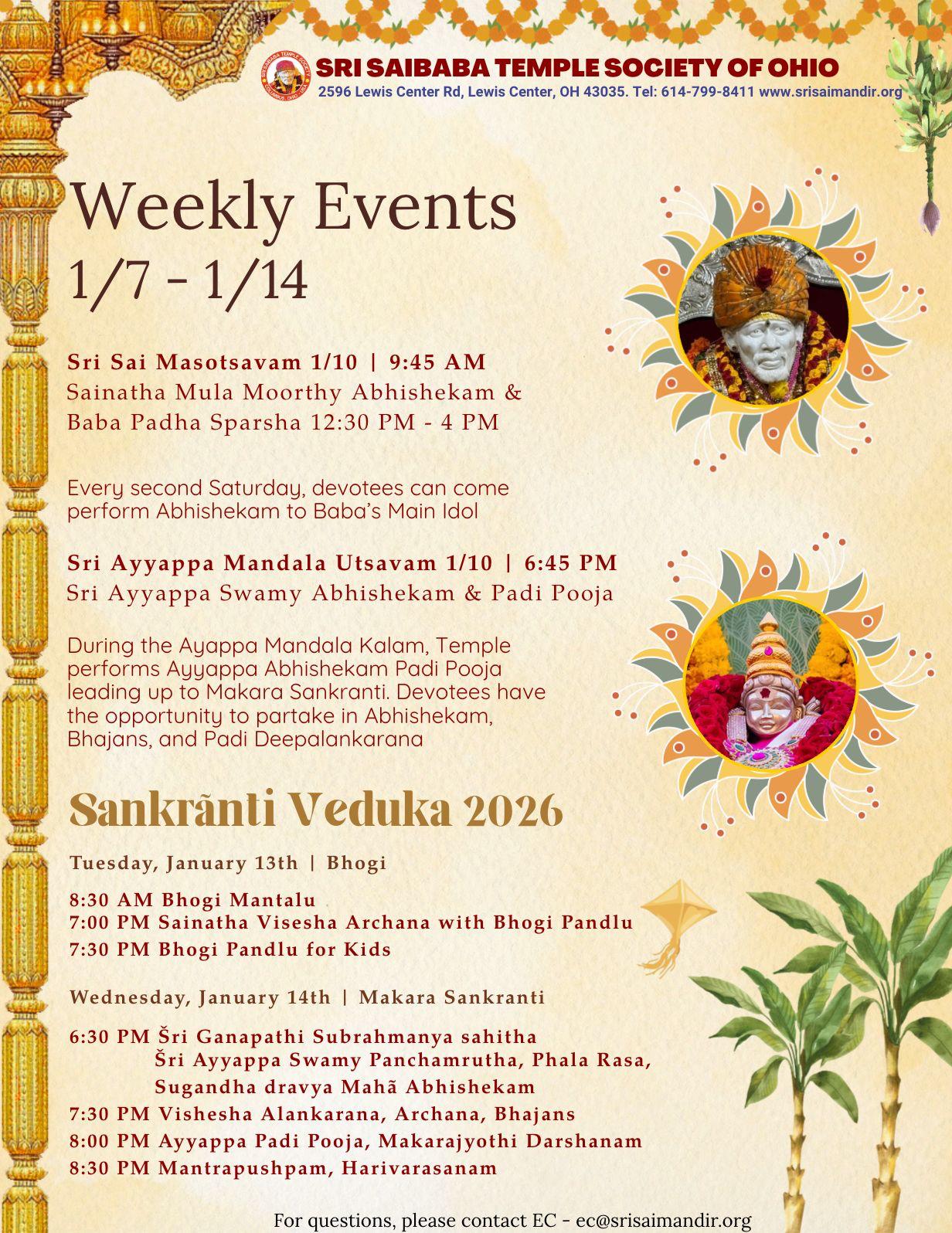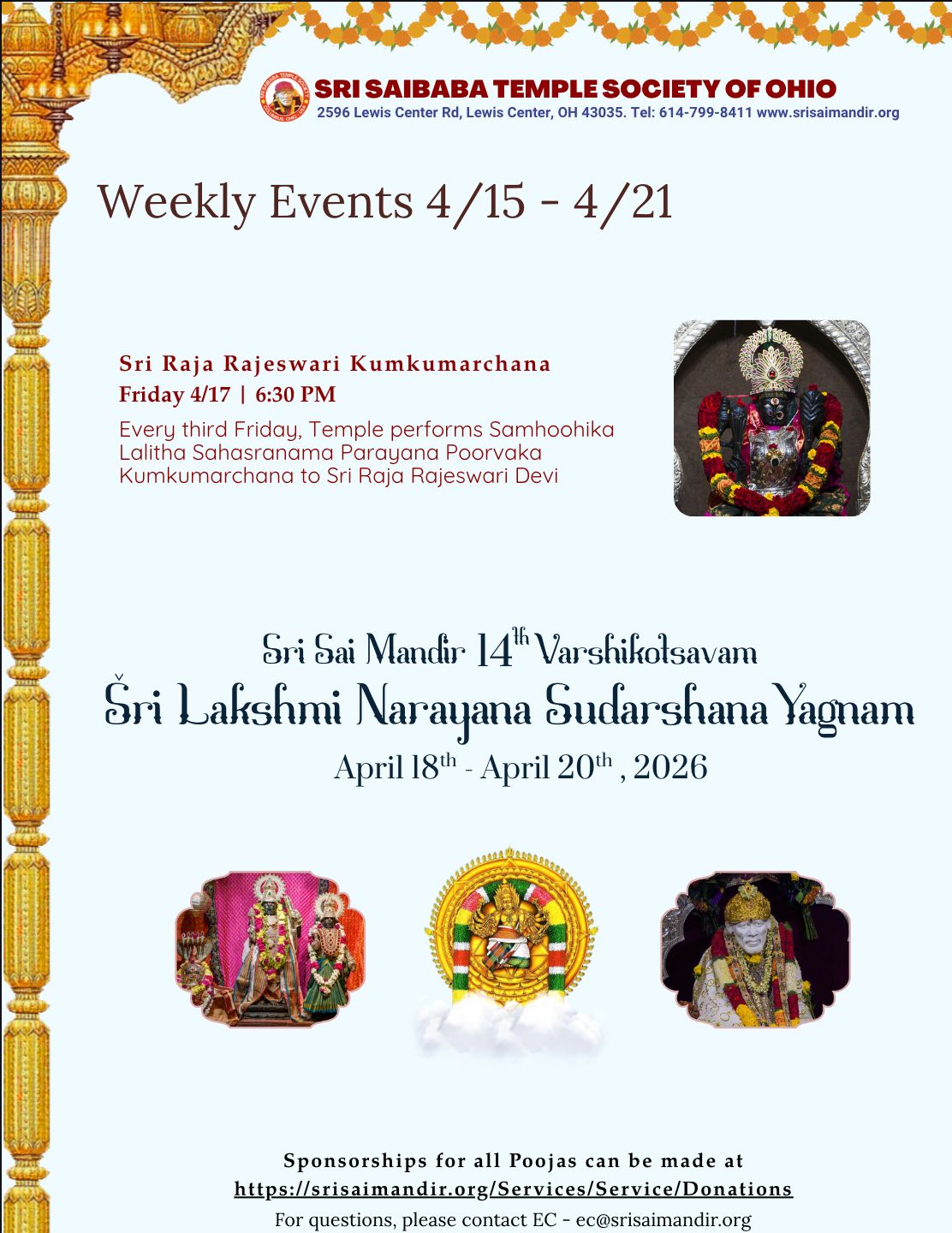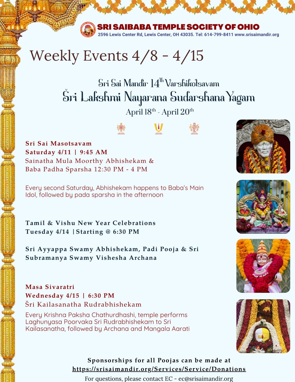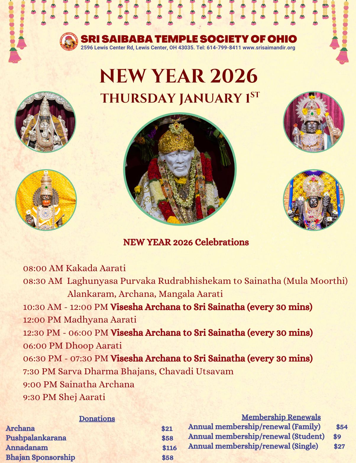 Devotees number grew over a period of time to hundreds, space was leased at New Market Mall, Columbus to provide a central place of worship for all Saibaba devotees. By the will and grace of Sri Saibaba, Sri SaiBaba Temple